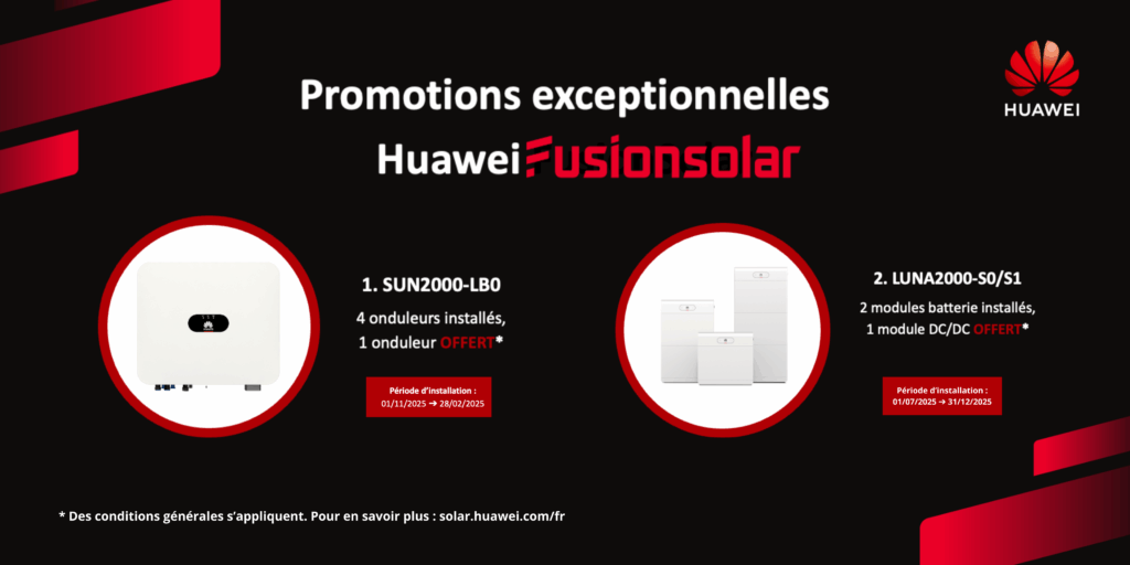 Découvrez nos offres spéciales sur les onduleurs, batteries et optimiseurs Huawei.